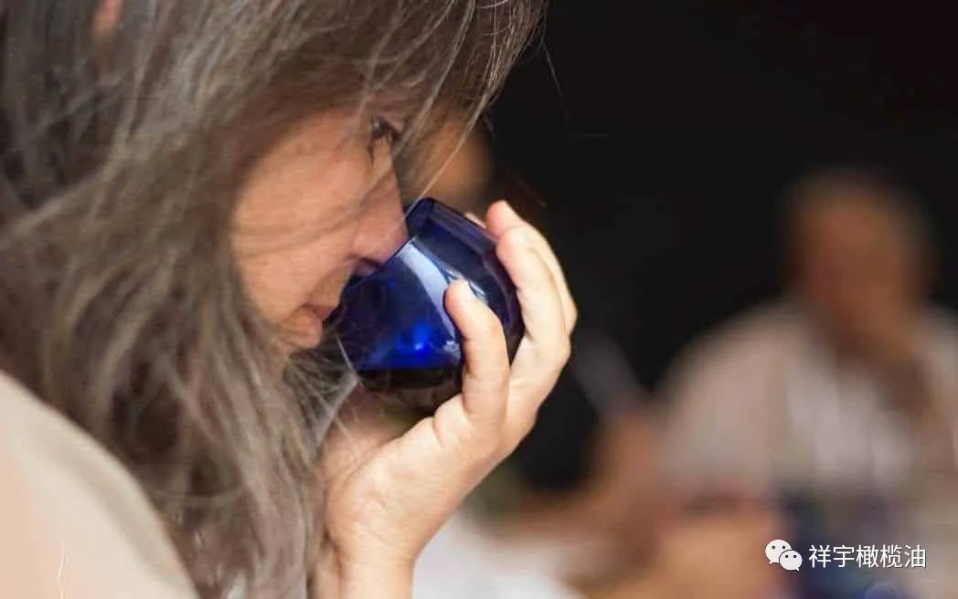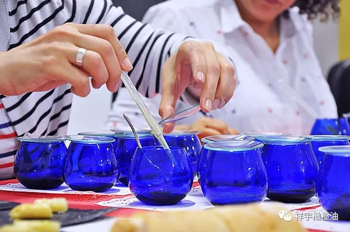 采用藍(lán)色郁金香型橄欖油品鑒專用杯。